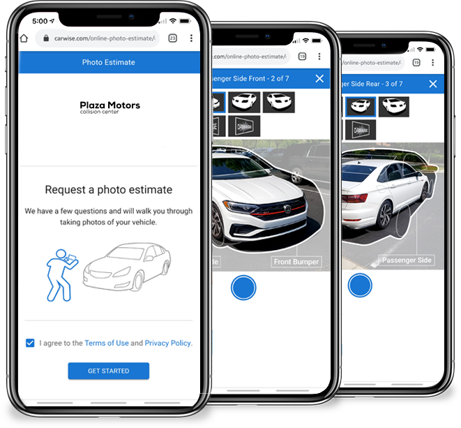 Plaza Motors Collision Center offers a quick & easy way to get an estimate on your vehicle from anywhere....at any time. That's right, the Plaza Motors Collision Photo Estimator allows you to get a complimentary estimate for you repair without having to visit our body shop in Maryland Heights. The whole process only takes about 5 minutes, requires you to take just 7 pictures and will put you in touch with our certified estimators in a matter of minutes. From there, we will arrange to come pick up your vehicle or schedule an appointment for you.